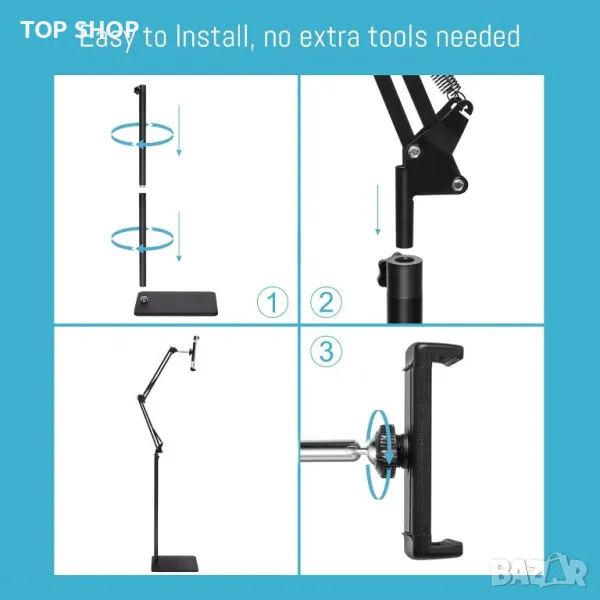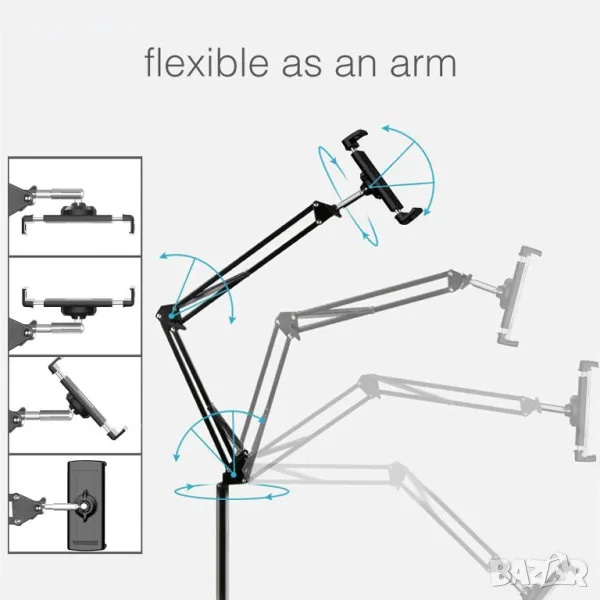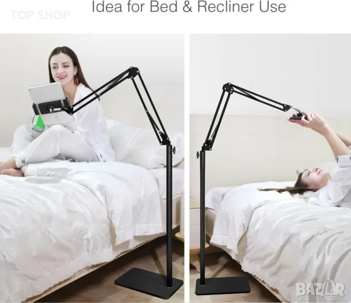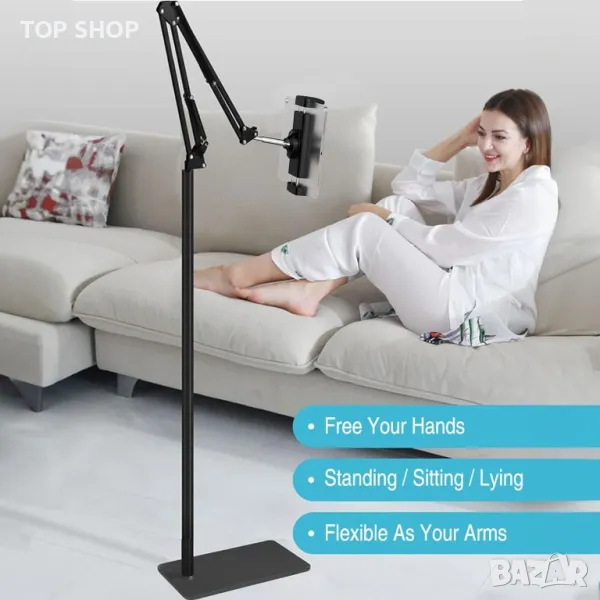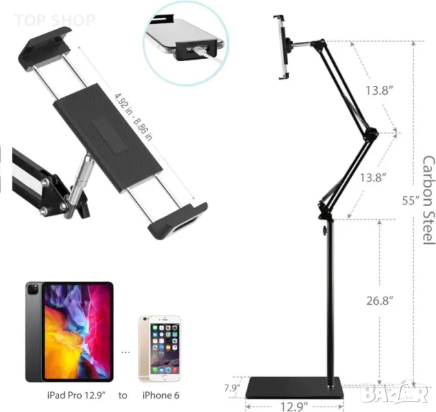 Изработена от висококачествена въглеродна стомана, тази стойка за таблет може да се похвали с несравнима здравина с увеличеното си базово тегло на 2,22 кг, което гарантира дълготрайна издръжливост. Меката подплата на стойката за пода и утежнената основа предпазват вашите таблети и пода от повреда. Насладете се на гледане със свободни ръце с гъвкави настройки за оптимални ъгли, идеални за гледане на филми, игри и др. Съвместима с устройства, вариращи от 4,7 до 12,9 инча, тази стойка предлага лесно сглобяване само за 5 минути и движение по 5 оси за безкрайна гъвкавост. Регулирайте височината от 70 до 140 сантиметра и завъртете на 360° за максимален комфорт.