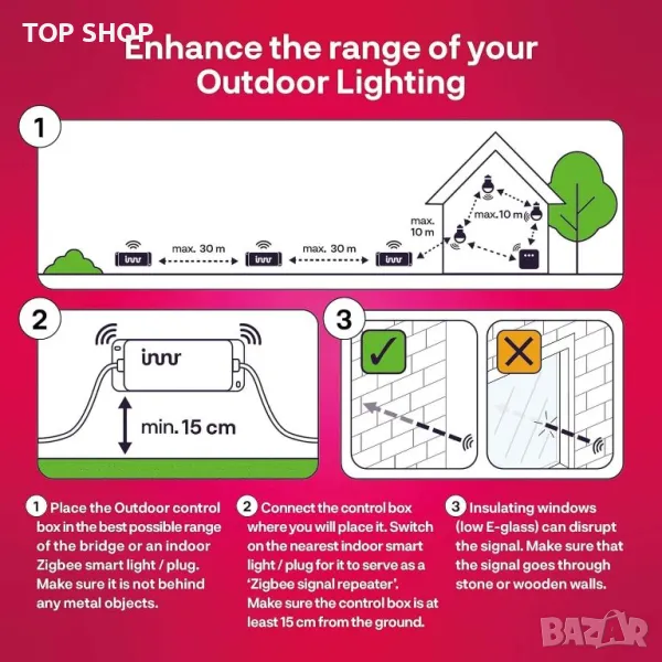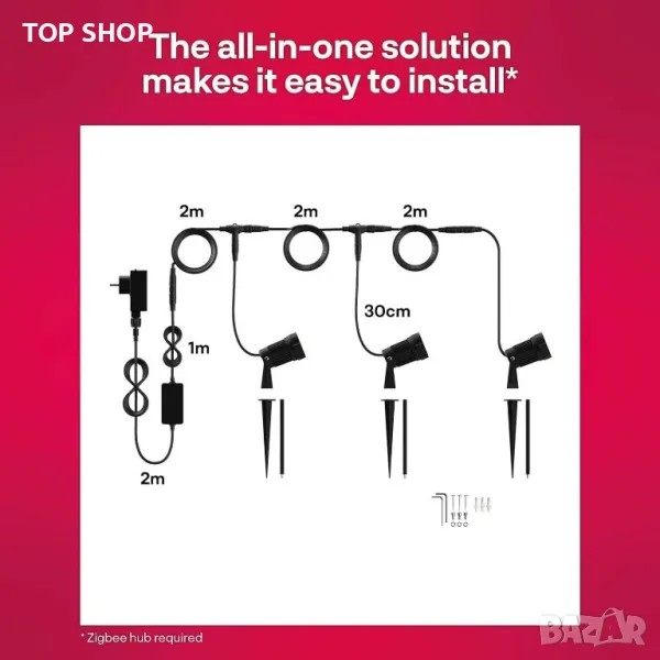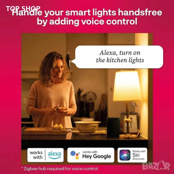 ВАЖНА ЗАБЕЛЕЖКА: Изисква съвместим хъб, като Philips Hue*, Samsung SmartThings или Innr. Не е необходим отделен мост при свързване към Amazon Echo Plus или Echo Show (2-ро поколение). *Не работи с HomeKit, Hue Entertainment, Hue Secure.