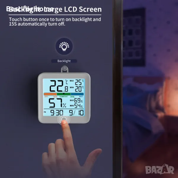 Голям LCD екран и подсветка-Размер 3,6*3,4*0,94 инча, Подобрен термометър за влагомер с 3,7-инчов голям LCD дисплей, по-лесен за четене от всякакъв ъгъл и разстояние. Включва сензорна икона с бяла подсветка, която улеснява четенето и осветяването на екрана при тъмни условия (автоматично изключване за 15 секунди).