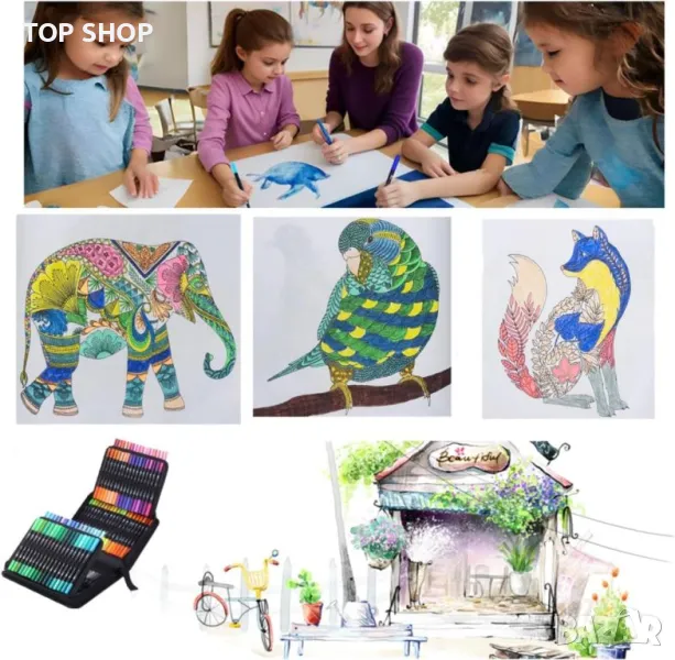 Този комплект флумастери с двоен връх разполага със 108 живи и различни цвята, с гъвкав връх на четка от 1-4 мм за оцветяване и засенчване и прецизен фин връх от 0,4 мм за очертаване и детайлна работа. Всяка писалка е проектирана с цветно кодирани капачки за лесно разпознаване. Писалките са направени от силни, нетоксични пигменти, които са бързо съхнещи и позволяват лесно напластяване и смесване без размазване. Те са подходящи за широк спектър от артистични приложения, включително манга, калиграфия, скициране и др. Този комплект е идеален подарък за различни поводи и е безопасен за използване с мастило на водна основа, което е без мирис. За издръжливост съхранявайте писалките плътно затворени на хладно и сухо място. Забележка: Не е подходящо за деца под 4 години поради малки части.