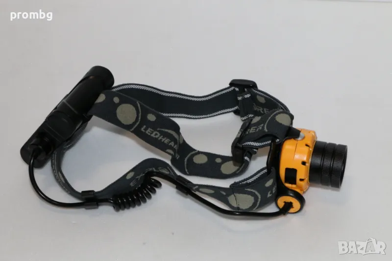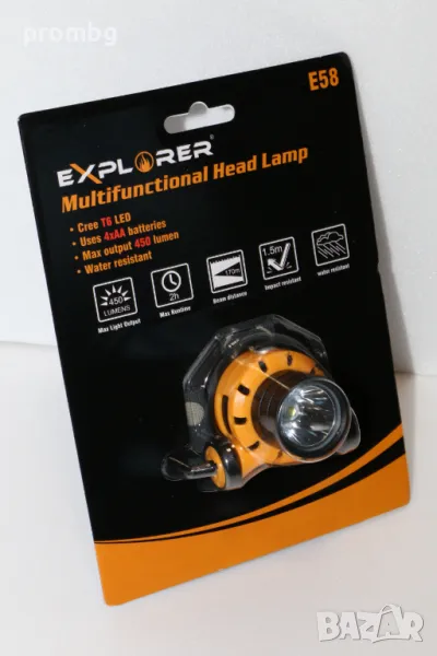 челник EXPLORER E58, Германия. Високо качествен материал, самолетен алуминий. Въртяща се глава на лампата, 5 светлинни програми (100% - 50% - 25% - бързо мигане, бавно мигане); максимален светлинен интензитет 450 лумена; защита IPX 6, осветеност до 170 м, продължителност на светене при максимална сила 2ч, размери на лампа 89 х 76 х 74 мм, работи с батерии 4 х АА /не са вкл./ Тегло 0,200 кг.