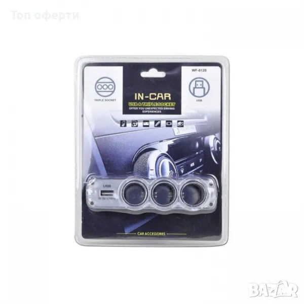 Разклонител с 3 гнезда за запалка и 1 USB порт разположени в горната част.