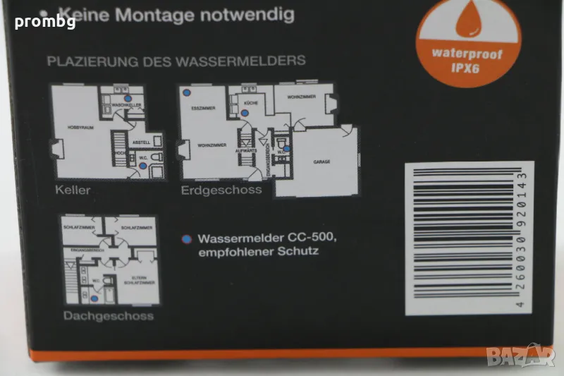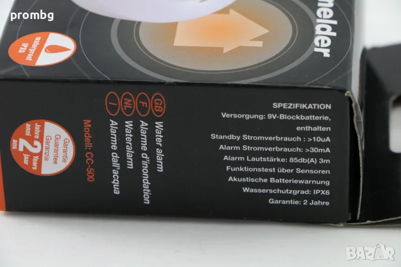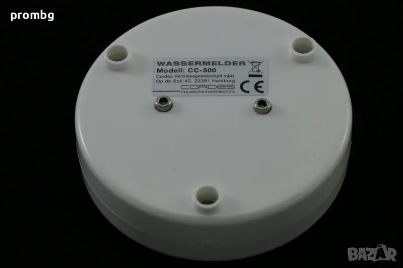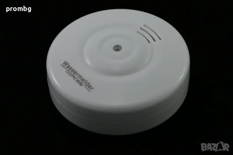 детектор за наводнение CORDES, Германия. При контакт с течност сензорите активират аларма от 85 dB. Детекторът има защита IPX6. Работи с батерия 9 V /включена в комплекта/. Тегло 120 гр.