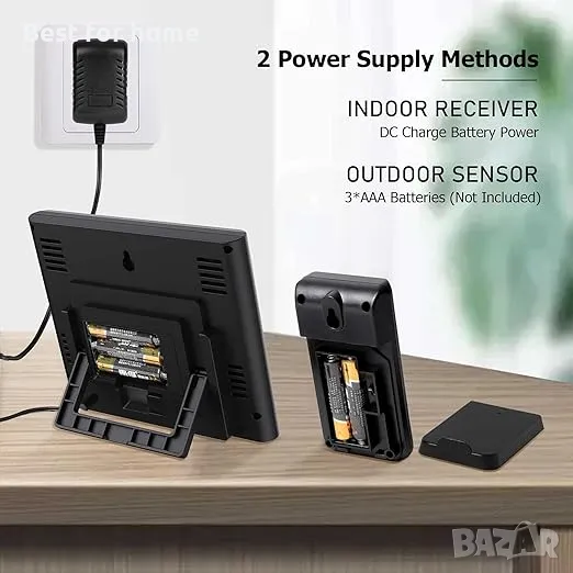 Режим на захранване – безжичният термометър отвън изисква 3 x AAA батерии (с изключение) или DC 5 V (включени) за захранване. Препоръчително е да се използва с адаптер, така че времето да остане нормално дори когато е изключено. Всеки път, когато батерията е празна, трябва постоянно да сменяте новата батерия.
