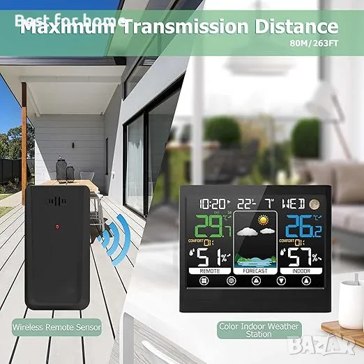 3 външни сензора Метеорологичните станции могат едновременно да се свържат с 3 безжични дистанционни сензора за открито в радиус от 80 метра около открито пространство, като същевременно измерват температурата и влажността на три места едновременно. Можете лесно да видите температурата и влажността в бебешката стая, винарската изба, избата и градината.