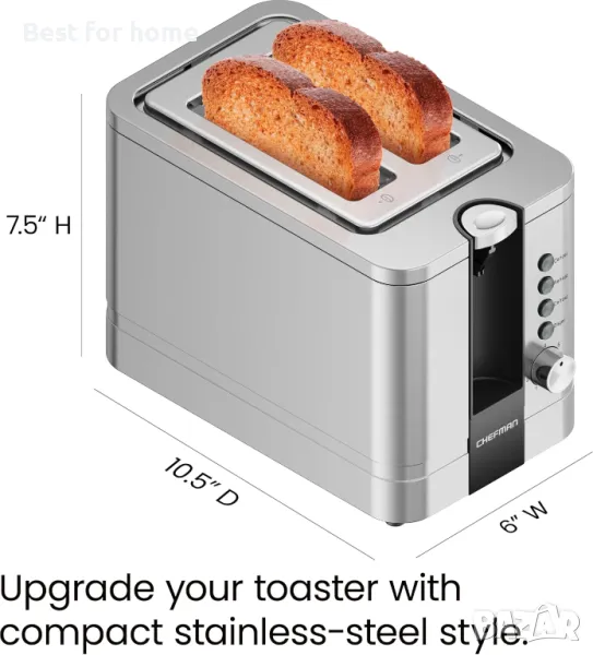 Изскачащ тостер Chefman с 2 филийки от неръждаема стомана със 7 настройки на нюанса, изключително широки отвори за препичане на гевреци, функции за размразяване/претопляне/отмяна, подвижна тава за трохи, 850 W, 120 V, сребрист.