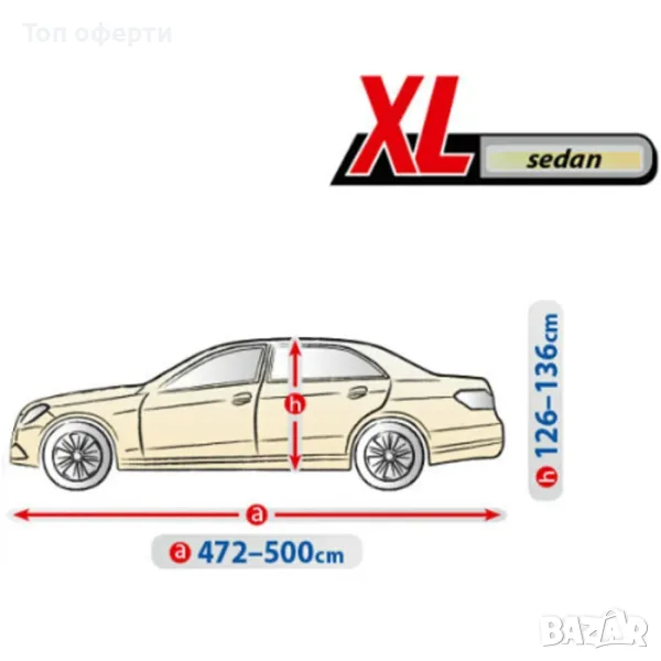 Сравнете формата на вашия автомобил със снимката на продукта (размерите са налични в поле "техническа информация"). Измерете колата си, като обърнете специално внимание на нейната дължина. Крайният размер е обиколката на автомобила, чрез този размер, ще имате по-точна представа кое покривало ще пасне най-добре.