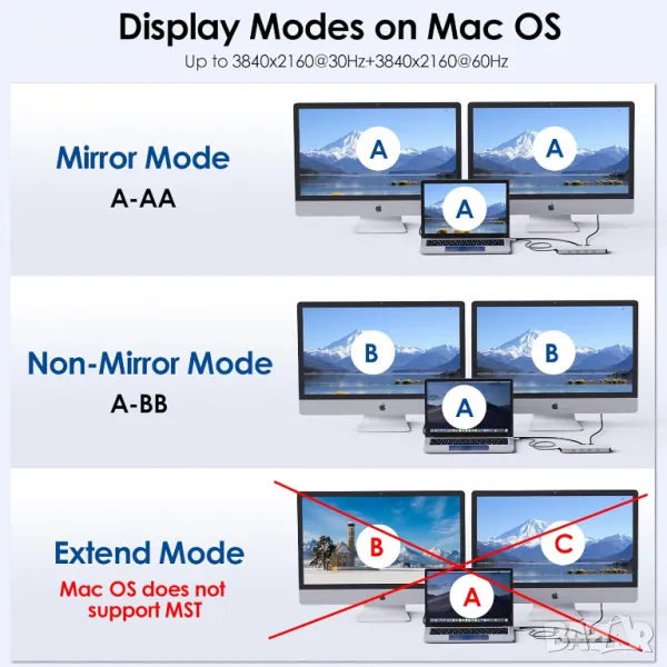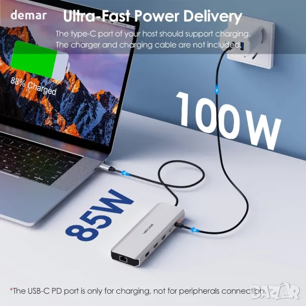 Тази докинг станция за лаптоп 10 в 1 поддържа вашето работно пространство подредено, като същевременно разширява функционалността с двоен HDMI (4K@60Hz + 4K@30Hz само за Windows), 100W порт за захранване (85W за лаптопи, зарядно не е включено) и бърз трансфер на данни през два 10Gbps USB-A порта, един 10Gbps USB-C порт, плюс допълнителни USB 3.0 и USB 2.0 портове за периферни устройства. Той също така разполага с Gigabit Ethernet порт за стабилни мрежови връзки. Уверете се, че вашето устройство поддържа DP1.4+DSC за оптимална резолюция.