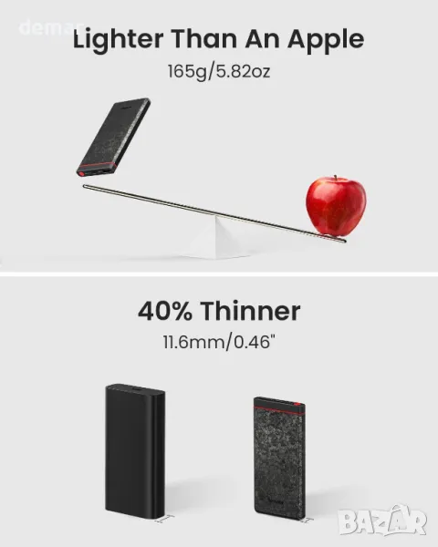 Тази ултратънка и лека захранваща банка от въглеродни влакна съчетава издръжливост с първокласен дизайн, тежи само 165 грама, като същевременно поддържа елегантен профил. Капацитетът му от 10 000 mAh осигурява енергия през целия ден, като зарежда iPhone 15 до 1,7 пъти и Samsung S24 до 1,5 пъти. Оборудван с USB-C и USB-A портове, той поддържа PD бързо зареждане с 22,5 W изход и 18 W вход, осигурявайки 71% заряд на iPhone 15 Pro Max само за 25 минути. Съвместим с множество протоколи за бързо зареждане, той захранва над 1000 устройства. Изработен от въглеродни влакна с висока якост, той е 80% по-издръжлив от PC материалите, по-лек от алуминий и по-здрав от стомана.