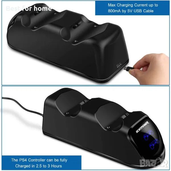 По-бързо зареждане – два безжични контролера PS4 Dualshock 4 се зареждат напълно едновременно в рамките на 2,5 до 3 часа, индивидуалното зареждане би било по-бързо.