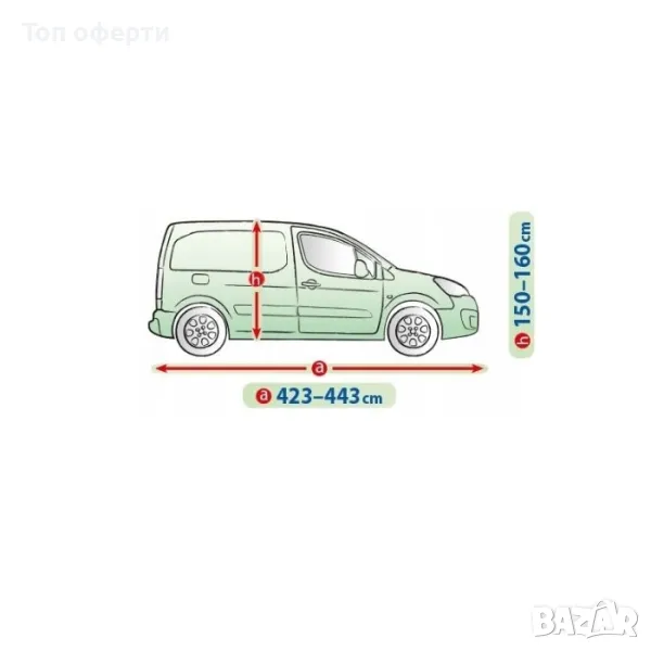 Сравнете формата на вашия автомобил със снимката на продукта (размерите са налични в поле "техническа информация"). Измерете колата си, като обърнете специално внимание на нейната дължина. Крайният размер е обиколката на автомобила, чрез този размер, ще имате по-точна представа кое покривало ще пасне най-добре.