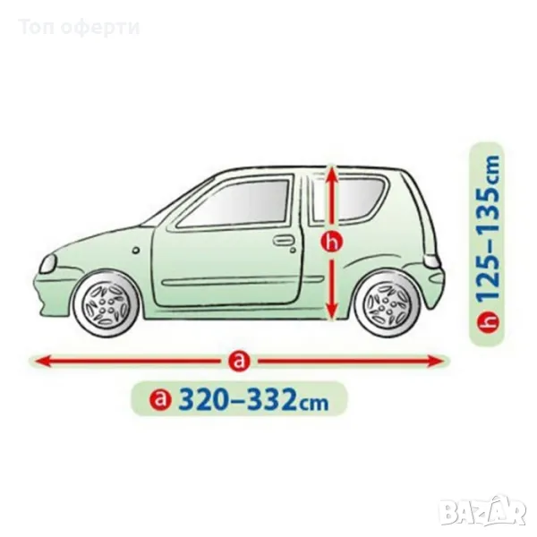 Сравнете формата на вашия автомобил със снимката на продукта (размерите са налични в поле "техническа информация"). Измерете колата си, като обърнете специално внимание на нейната дължина. Крайният размер е обиколката на автомобила, чрез този размер, ще имате по-точна представа кое покривало ще пасне най-добре.