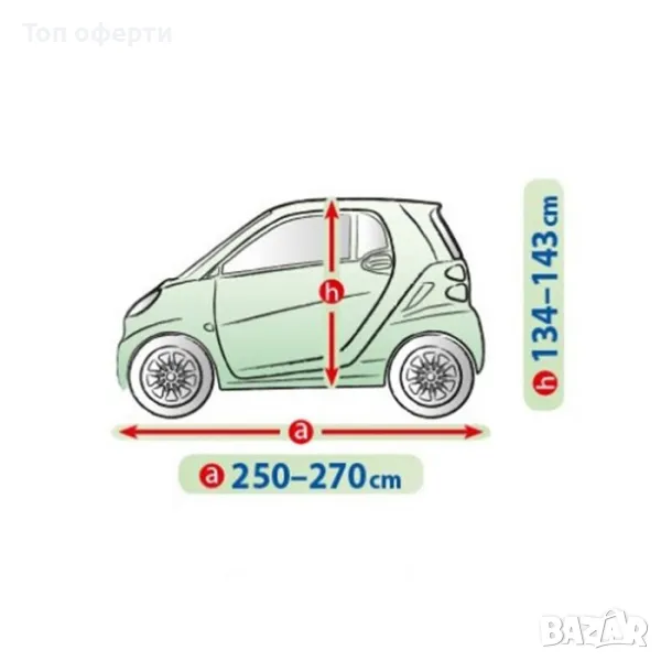 Сравнете формата на вашия автомобил със снимката на продукта (размерите са налични в поле "техническа информация"). Измерете колата си, като обърнете специално внимание на нейната дължина. Крайният размер е обиколката на автомобила, чрез този размер, ще имате по-точна представа кое покривало ще пасне най-добре.
