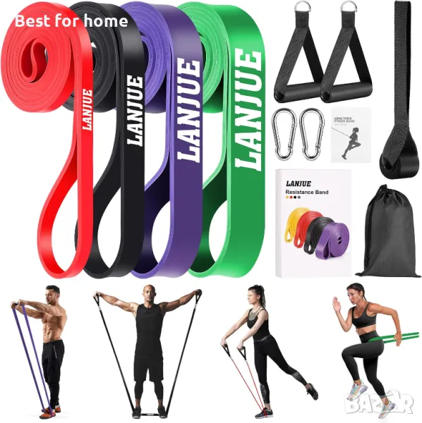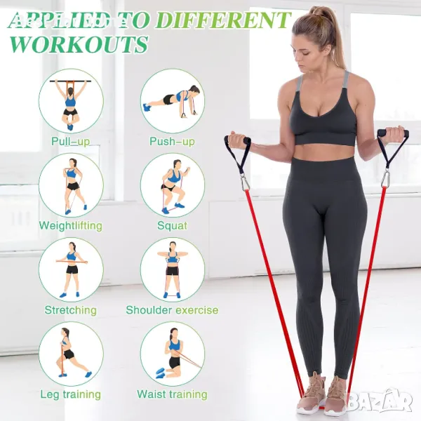 Комплект спортни еластични ленти 4 бр. съпротивителни ленти с 4 различни опъна: червени 15-35 lbs, черни 25-65 lbs, лилави 35-85 lbs, жълти 50-125 lbs, използвани самостоятелно или в комбинация за получаване на различни сили на опън. Предлага се също с 1 чанта, 1 закрепване за врата, 2 дръжки, 2 карабинера, 1 ръководство за употреба. Направете фитнеса си по-разнообразен и интересен.