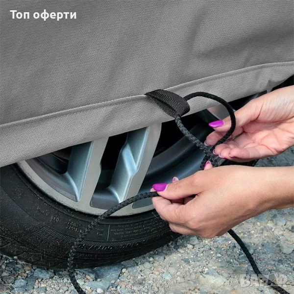 Горната част на покривалото е водоустойчиво и паропропускливо. Не се намокря, като същевременно отвежда влагата под капака навън. Гладък SPUNBOND от вътрешната страна, няма да надраска автомобила.