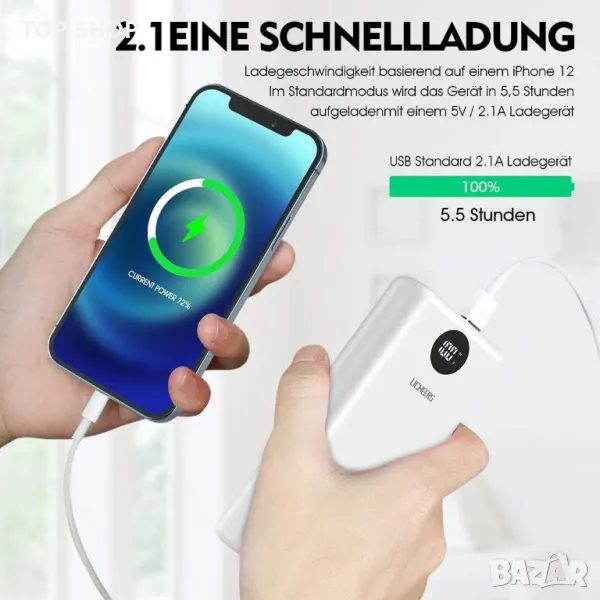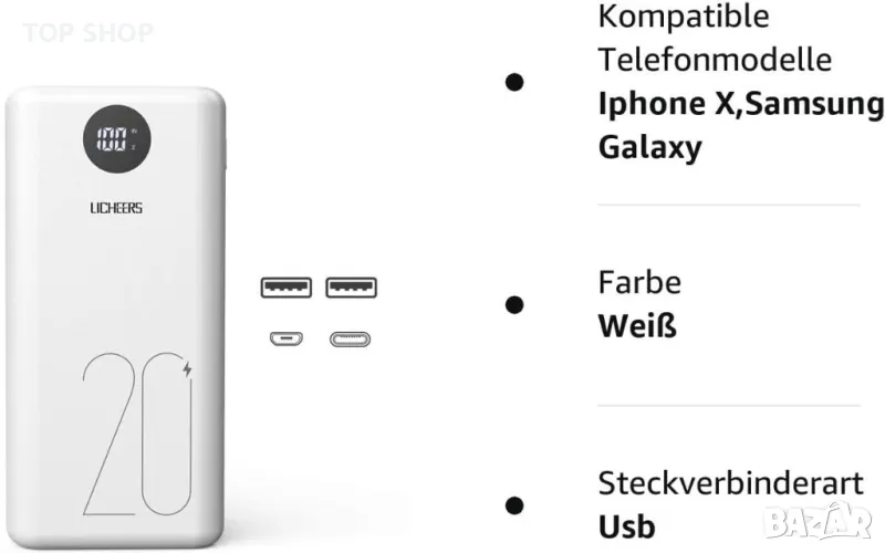 Моля използвайте системата за съобщения! Просто изпратете запитване. По телефона се губи време за уточняването на търсения от Вас продукт.Представяме Ви външната батерия на Licheers: захранваща банка с голям капацитет от 20 000 mAh с USB Type-C конектор(2 port-a). Тази елегантна, бяла батерия осигурява надеждно зареждане при 5 волта, като гарантира, че вашите устройства остават захранвани в движение.