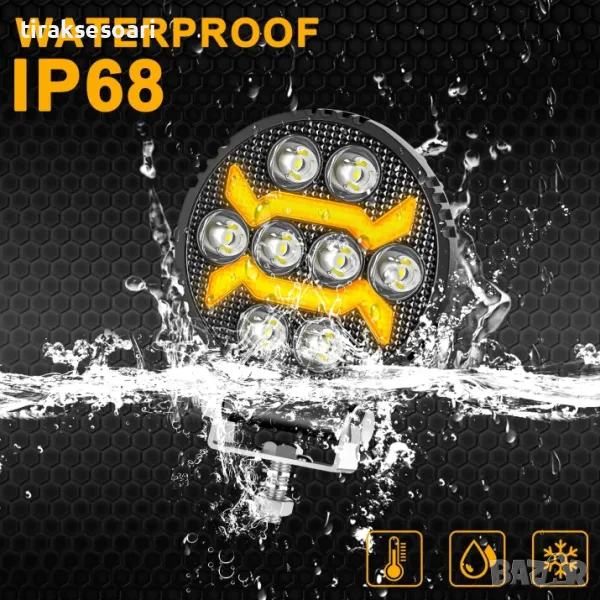 Универсална мощна LED ЛЕД диодна лампа халоген фар с бяла светлина и DRL жълта светлина 1500LM за камион трактор ролбар оффроуд АТВ джип земеделски и селскостопански машини и др. 12-24V
