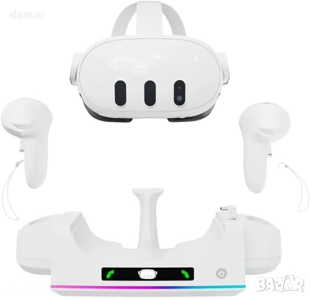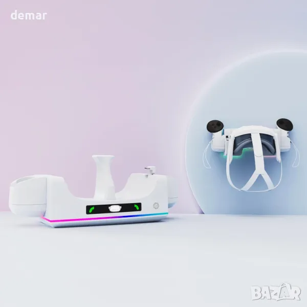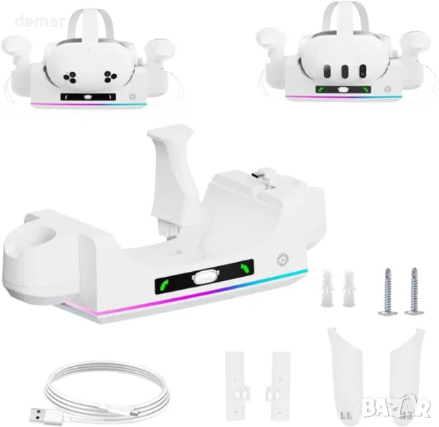 Проектирана за Meta Quest 3S/Quest 3, тази докинг станция за зареждане захранва слушалките и контролерите едновременно, като същевременно ги поддържа добре организирани. Интелигентните LED индикатори показват състоянието на зареждане с червени, сини и зелени светлини, докато RGB светлинна лента подобрява настройката. Ефективно място с опции за монтиране на бюро или стена, включва специални гнезда за контролери и стабилна стойка за слушалки. Подложките против плъзгане осигуряват стабилност, предотвратявайки движение или падане. Пакетът включва USB-C конектор, кабел за зареждане, акумулаторни батерии на контролери, капаци на батериите и винтови комплекти за лесна настройка.