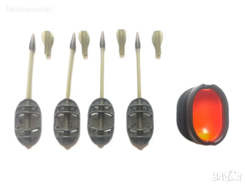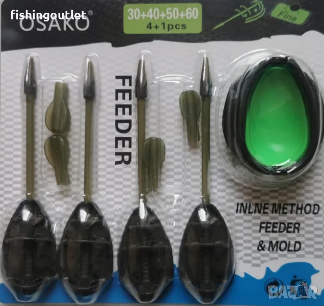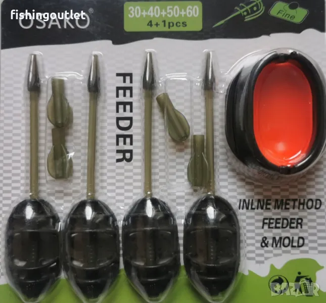 Комплект метод фидер хранилки Osako Inline Method Feeder - 4 броя хранилки 30,40,50 и 60гр в комплект с преса. Хранилките са с отлично качество на изработка и материал ,подходящи както за затворени водоеми ,така и за река.С перфектна форма са за достигане на далечна дистанция.Отлично качество-цена