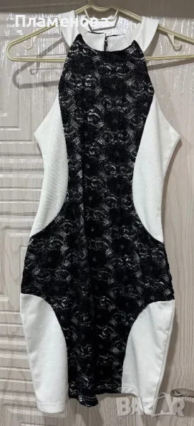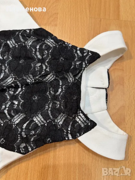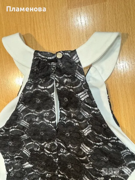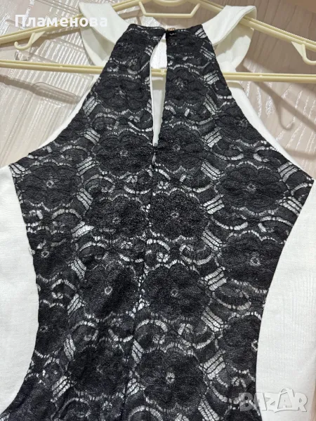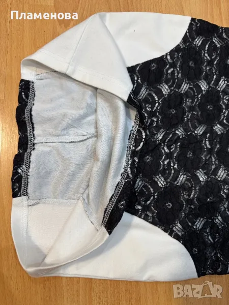 Бяла рокля с черни дантелени цветя по средата, еднаква отпред и отзад. Изключително мека и удобна материя. Обличана е веднъж, изглежда като чисто нова.
