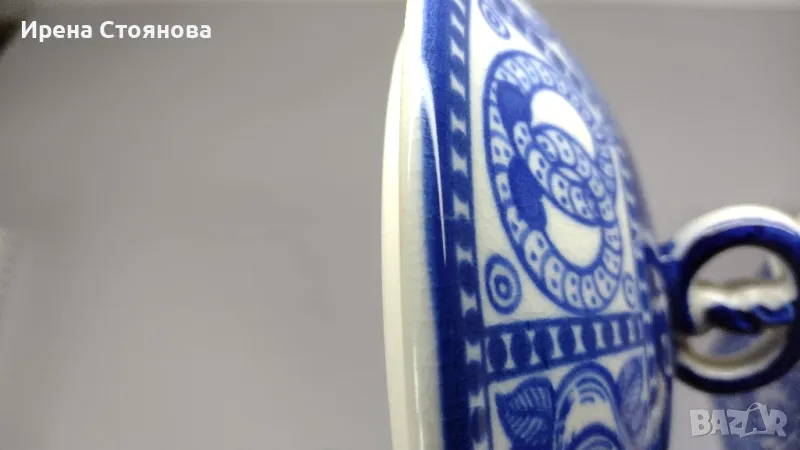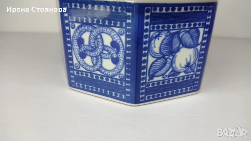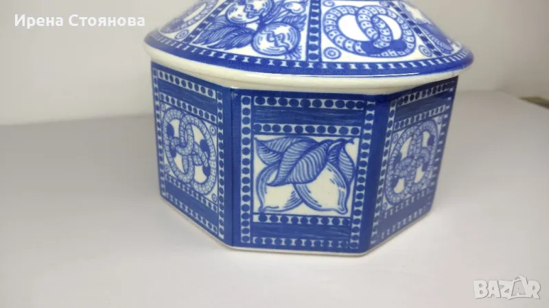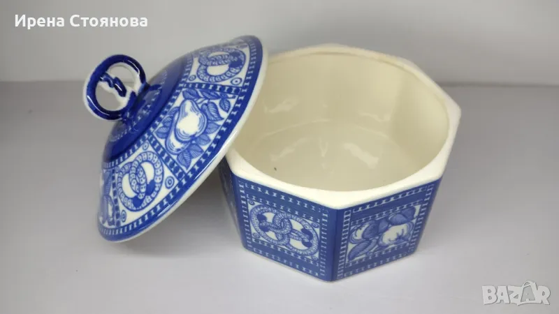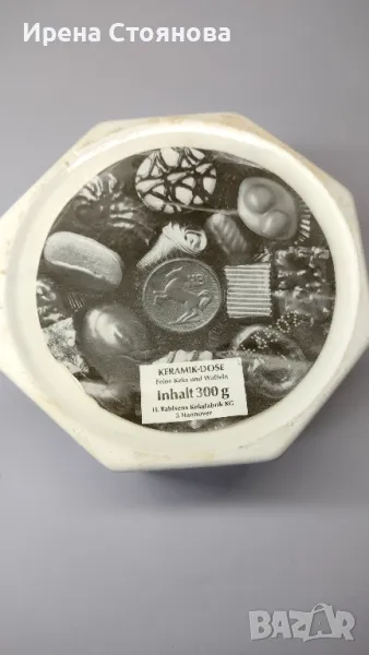 Стара, винтидж керамична кутия за бисквитки, произведена в периода между 1914 - 1920 г. за немска фабрика за бисквити H. Bahlsen в Хановер. Бисквитиера в стил Арт Нуво е проектирана от Гертруд Kpaym през 1914 г. Осмоъгълната кутия е украсена с кобалтово сини, ръчно рисувани гевреци и плодове.Височина с капак 16 см, без 8,5 см, диаметър 17 см. Без основен знак, само хартиен етикет с производител и грамаж (300 гр.) Произведените през 1960-1980 г. имат кръгъл печат със синьо мастило върху основата с надпис, например: Entwurf Gertrud Kraut - H. Bahlsens Keksfabrik 3 Hannover - Neuauflage einer Dose von 1914.Кутията за бисквити е в добро състояние, използвана, с леки следи от употреба. Като забележка, наличие на кракле (в близък план) и при капака малка пукнатина, не е по цялата дължина. Цена 65 лв.