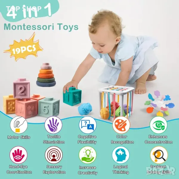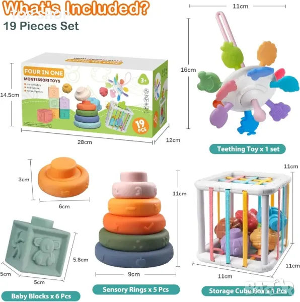 Създаден за бебета, този Монтесори комплект играчки предлага уникални форми, ярки цветове и различни методи на игра, за да предизвика любопитство и изследване. Изработени от висококачествен, хранителен силикон и ABS, тези играчки са 100% безопасни, без BPA и без фталати, което гарантира, че са нетоксични и лесни за почистване. Комплектът включва 6 блока за подреждане, 5 пръстена за подреждане, играчка за зъби, куб Монтесори и 6 блока с форма, всички безопасни за дъвчене и хващане. Докато доставят максимална радост, тези играчки помагат за развитието на концентрацията, фините двигателни умения, координацията око-ръка и сензорното изследване. Кубът за двигателни умения включва цветни еластични ленти и текстурирани форми за подобряване на уменията за разпознаване, докато играчката за зъби има множество точки за гризане за комфорт. В допълнение, меките силиконови градивни елементи издават звуци и имат релефен дизайн, за да насърчават уменията за броене, разпознаване на цветове и съвпадение по забавен и увлекателен начин.