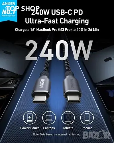 Нов Anker Prime USB-C кабел 240W за iPhone 15, MacBook, iPad, Galaxy → Обява 49339183