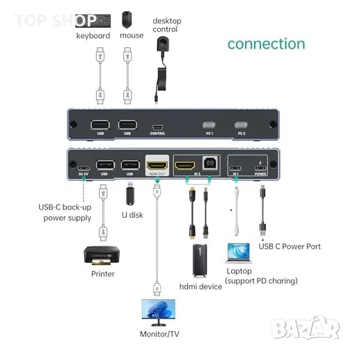 Нов Превключвател 2 Порта USB C/HDMI + Кабели MT-VIKI 4K KVM