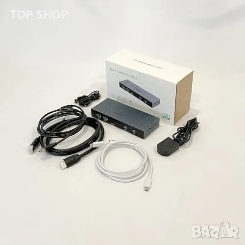Комплектът включва: 1x KVM превключвател, кабели (1x USB A-B, 1x HDMI, 2x USB C - 1.5 метра)