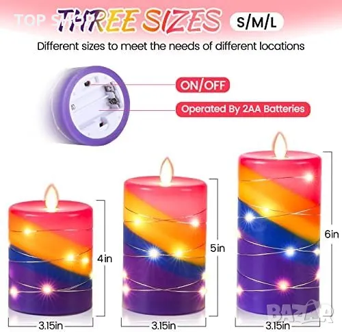 Изработени от парафинов материал в цветовете на дъгата, включваща комплект от три стъпаловидни цилиндрични свещи.