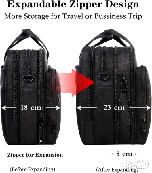 * Разширяем капацитет: Разширяемият цип прави ширината на чантата за лаптоп по-голяма от 18см до 23см, с по-голямо пространство за съхранение, осигурявайки допълнителен капацитет за вашите вещи по време на пътуване със самолет и бизнес пътувания. Възможност за прибиране на 13/14/15/16/17 инчов лаптоп.