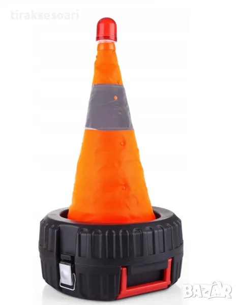 - Сгъваем предупредителен конус с рефлектор за светлина – осигурява добра видимост при ремонт или инцидент през деня и нощта.