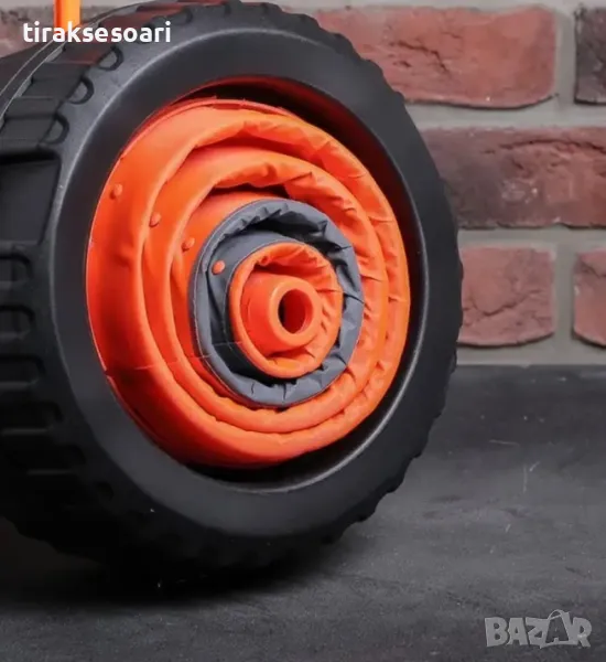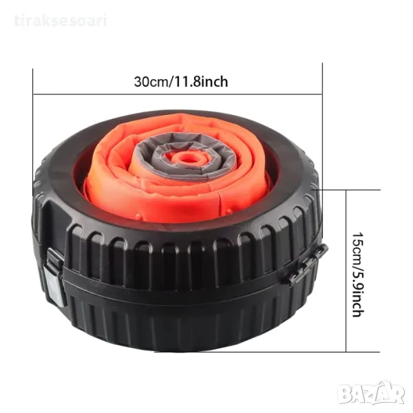 Комплектът е събран в компактна и здрава кутия с форма на гума, която лесно се пренася и съхранява в автомобила. Включва всички основни инструменти и аксесоари, от които може да се нуждаете в случай на авария.
