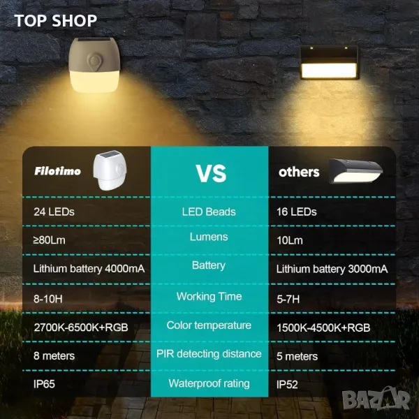 Моля използвайте системата за съобщения! Просто изпратете запитване. По телефона се губи време за уточняването на търсения от Вас продукт.Многоцветната външна соларна стенна лампа Filotimo с RGB предлага 16 милиона цвята и 8 режима, включително музикален ритъм и функции за таймер. Водоустойчива е с рейтинг IP64, подходяща за вътрешна и външна употреба, с обхват на сензора за движение 26 фута/8 м. Можете да го управлявате чрез Amazon Alexa, Google Assistant или Bluetooth, позволявайки групов контрол, време, памет и синхронизиране на музика. Има два режима на зареждане (соларен панел или USB) и 4000 mAh акумулаторна батерия. С 2 работни режима и 3 работни статуса, тя е лесна за използване и подходяща за различни места, осигурявайки празнично осветление за събития като Коледа и Хелоуин.