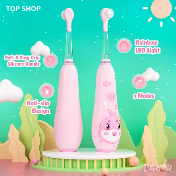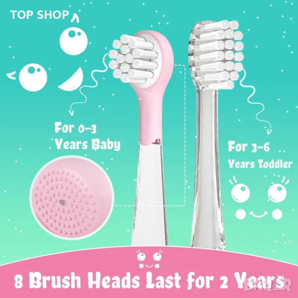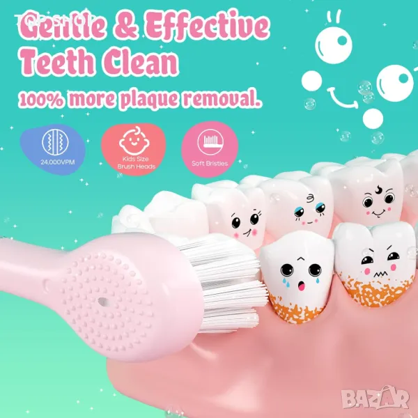 Тази детска електрическа четка за зъби е проектирана да направи миенето на зъбите забавно и ефективно с цветни LED светлини, помагащи на родителите да следят устната хигиена на детето си. Той разполага с удобна за деца, неплъзгаща се дръжка и се зарежда с магнитна технология, предлагайки до 60 дни употреба при 4-часово зареждане. С хидроизолация IPX7, той е безопасен за използване в банята. Четката за зъби осигурява 24 000 вибрации в минута за превъзходно отстраняване на плаката. Включва 8 резервни глави за 2 години употреба, с ултра меки косми без BPA, подходящи за деца на възраст 0-6 години. Вграден 2-минутен таймер с 30-секундни интервали насърчава добрите навици за четкане.