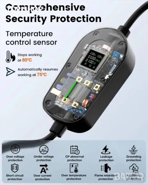 Това EV зарядно устройство разполага с LCD екран за наблюдение в реално време, регулируеми настройки на тока (6/8/10/13A) и функция за зареждане по график (1-12 часа) за оптимизиране на разходите по време на ненатоварени цени. Изработен с издръжлив 6,1 м TPU кабел и ABS твърда обвивка, той издържа на големи натоварвания, тестове на падане и продължителна употреба, осигурявайки дълготрайна надеждност. Безопасността е с приоритет с хидроизолация IP65, множество защитни механизми и сертификати (CE, UKCA, ROHS). Съвместим с повечето електромобили в Обединеното кралство и Европа, използвайки тип 2 до 3-пинов щепсел, той предлага гъвкаво и сигурно зареждане за дома или при пътуване.