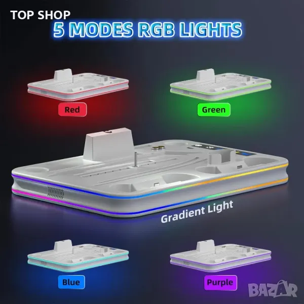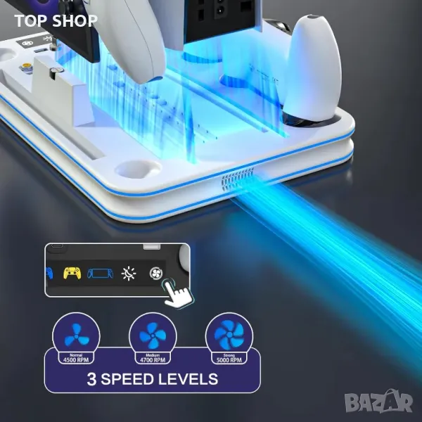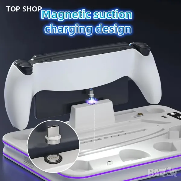 PS Portal Remote Player и дори слушалките PS5. Той разполага с ултра тихи, регулируеми турбо охлаждащи вентилатори за предотвратяване на прегряване по време на продължителна игра, с три настройки на скоростта. Стойката също така зарежда едновременно контролерите PS Portal Remote Player, DualSense и Edge, като използва магнитен дизайн за удобство. Ясният LED индикатор показва състоянието на зареждане, докато персонализираното RGB осветление добавя стилен щрих. Проектиран за пестене на място и организация, той държи всичко спретнато на едно място, осигурявайки безопасност и стабилност с издръжлива конструкция.