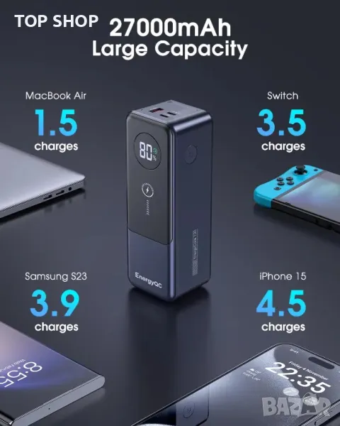 Тази захранваща банка разполага с огромен капацитет от 27 000 mAh, което й позволява да зарежда MacBook Pro 14'' до 50% само за 35 минути и да го зарежда напълно приблизително 1,5 пъти, заедно с множество устройства като iPhone 14 и Samsung S23. С обща мощност от 120 W и 100 W вход за пълно презареждане за 1,5 часа, той позволява бързо зареждане през два Type-C и един USB-A порт, поддържайки едновременно зареждане за до три устройства. LED цифровият дисплей показва състоянието на батерията, докато режимът за нисък ток осигурява безопасно зареждане за по-малки устройства. Подобрените функции за безопасност предпазват от презареждане и късо съединение, което го прави широко съвместим с различни лаптопи и смартфони.