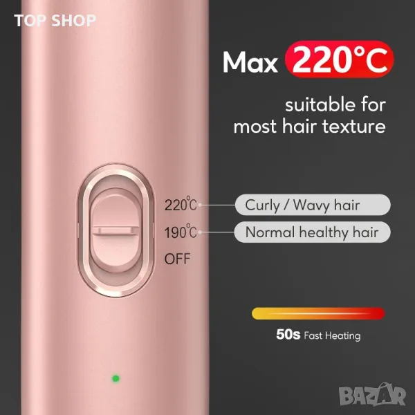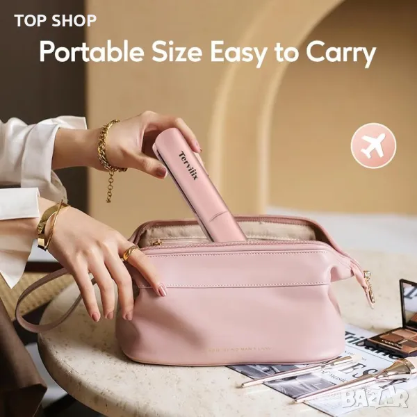 Безкабелната пътна преса за коса Terviiix, USB-C презареждаема, предлага изключителна преносимост, елиминирайки нуждата от електрически контакти. С максимална температура от 220°C и бързо 50-секундно нагряване, той позволява бързо и гъвкаво оформяне на гладка права коса или буйни къдрици. Батерията му от 4500 mAh осигурява 35-50 минути употреба, като се зарежда напълно само за 2,5 часа. Усъвършенстваната турмалинова керамична технология с вливане на арганово масло и кератин осигурява равномерно разпределение на топлината, намалява къдренето и оставя косата гладка и блестяща. Той разполага с безопасна защита при зареждане и е идеален за пътуване, фитнес сесии или ретуши в движение.