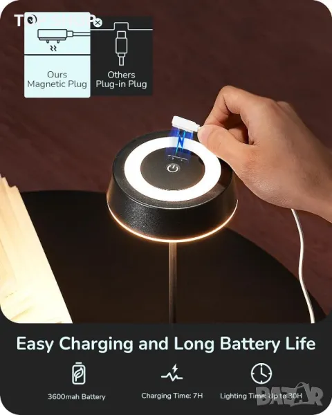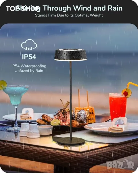 Тази многофункционална настолна лампа, работеща с батерии, разполага с регулируемо затъмняване от 10% до 100% и опции за цветова температура между топла (3000K) и студена (4000K) светлина, което ви позволява да зададете перфектната атмосфера за всяка обстановка. Нейната магнитна система за зареждане предлага удобство, като просто прикрепите зарядното устройство към главата на лампата за лесно презареждане без кабел. Лампата е оборудвана с издръжлива 4400mAh акумулаторна батерия, осигуряваща до 6 часа светлина при максимална яркост и 30 часа при най-ниска настройка. Той има компактен и преносим дизайн с размери ∮10CM × H33CM, което го прави лесен за носене за използване на открито. Модерният, минималистичен дизайн със здрава желязна основа и водоустойчив рейтинг IP54 го прави едновременно издръжлив и стилен, пасващ на различни стилове на декорация и идеален за използване на тераси, в градини или на закрито като практично, но декоративно решение за осветление.