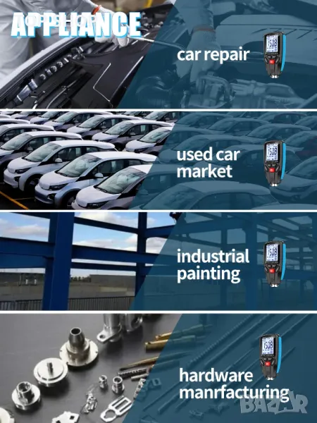Автоматичен измервател на дебелината на боята, практичен инструмент, предназначен за отчитане на дебелината на стоманената и алуминиевата боя без разрушаване. Той разполага с прецизна интегрирана сонда, която автоматично идентифицира черни и цветни субстрати. Идеален за различни приложения, включително автомобилни бои, прахово боядисване, анодизиран алуминий и др. Този уред помага да се спестят пари при закупуване на употребявани автомобили, като лесно се откриват несъответствия в дебелината на боята, като се гарантира прозрачност в историята на автомобила. С неговия голям дисплей потребителите могат без усилие да четат тип метал, режим на работа, състояние на батерията и измерени стойности в µm или mils.