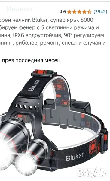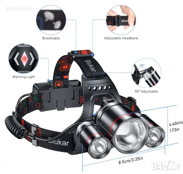 LED акумулаторен челник Blukar, супер ярък 8000 лумена с 5 режима и червена светлина, IPX6