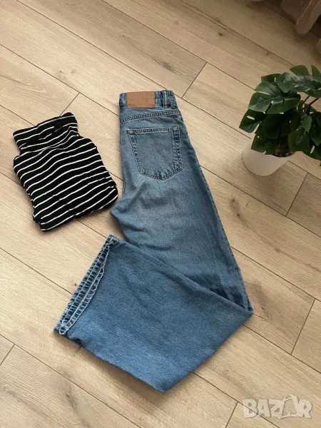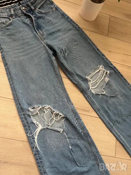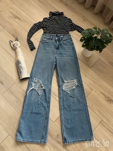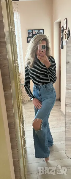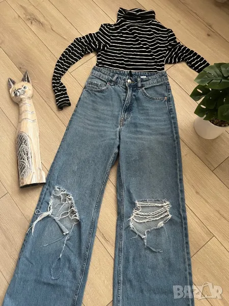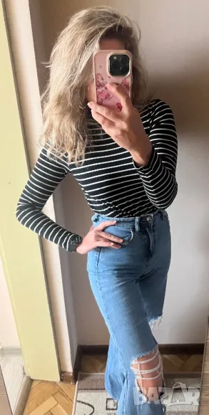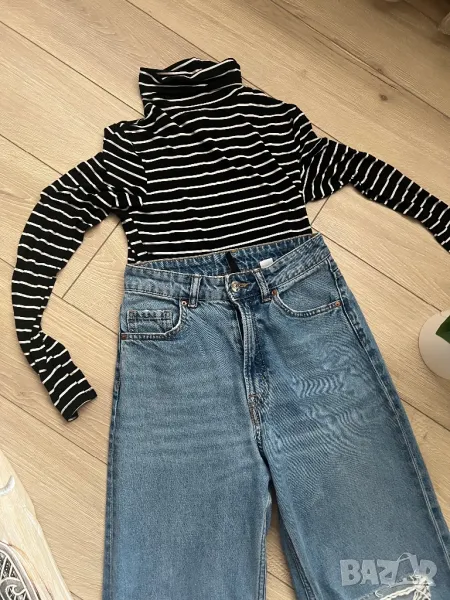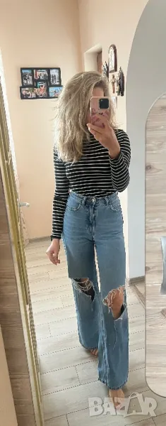 И двете неща са размер ХS. Дънките са без еластичност, фабрично доста накъсани, с висока талия. Полото е еластично. Цената е за двете.