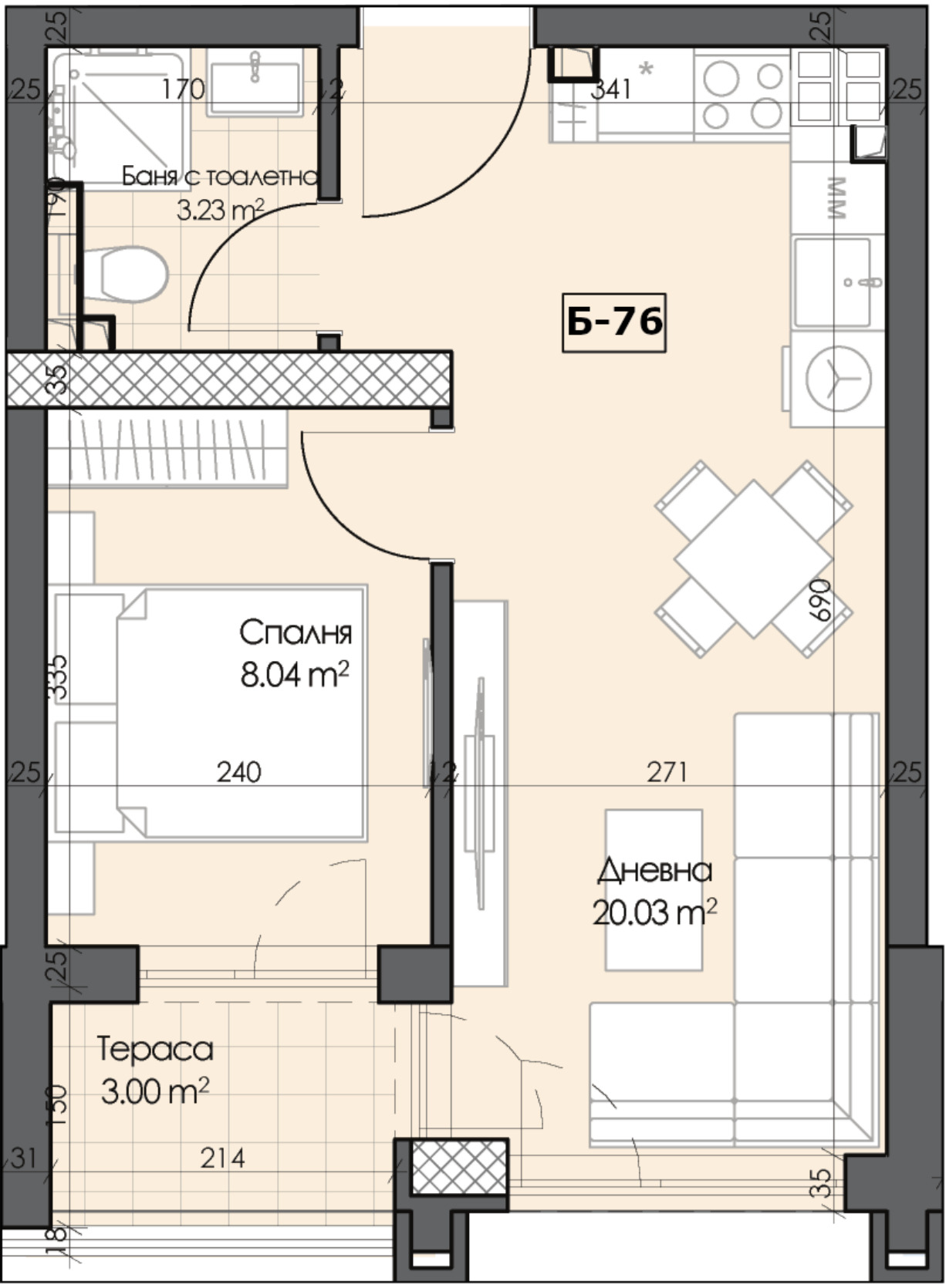 Предлагаме на вашето внимание двустаен апартамент, състоящ се от дневна, спалня, баня с тоалетна и тераса със западно-южно изложение в секция Б.