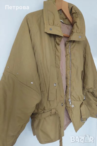 Маслинено зелен костюм в две части, спортно елегантен, удобен за ежедневието, с топла подплата и непромокаем плат. Яке с ефектна кройка и дизайн, висока яка, ефектни широки ръкави, украсени с декоративни тегели и капси, дълж. 60 см, два джоба с капаци, с колан, в раменете 40 см,, талия 92 см, дължина 65 см, с цип и капси. Полата е с плоха отпред, с два странични джоба, с цип отзад 22 см, талия 76 см, ханш 110 см, дължина 77 см. По етикет комплектът е 42 размер. Цена 70 лв. Изпраща се с 10% намаление от общоприетата куриерска такса.