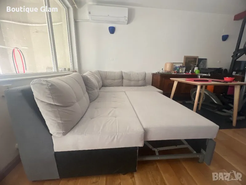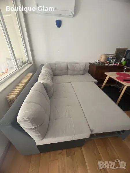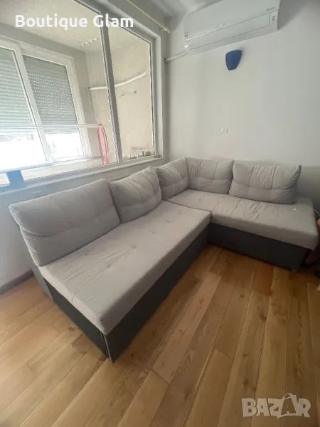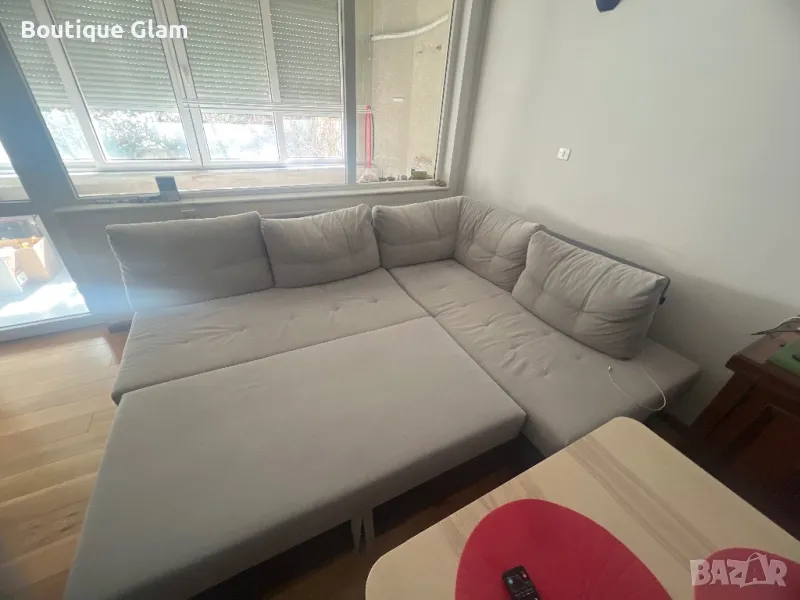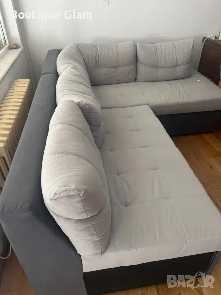 Няма забележки, ъглов сив диван , който се разтяга и става широка спалня С махащи се възглавници не са фиксирани.