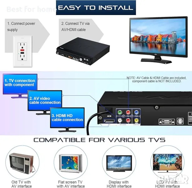 Широко съвместим-Свържете DVD плейъра към вашия телевизор чрез един обикновен HDMI кабел или AV кабел. Стар телевизор и телевизор с плосък екран с AV интерфейс; Дисплей и LCD телевизор с HDMI интерфейс. USB порт за възпроизвеждане на вашите филми, музика и снимки от USB флаш устройство (Поддържа AVI、MPG、MPEG、JPEG、MP3、WMA、JPG、AVOB、MOV, ASF)