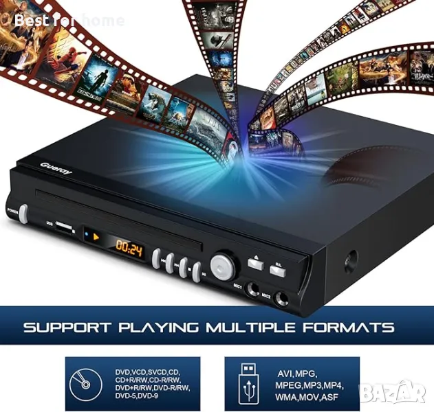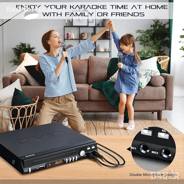DVD плейър, дисков плейър с HD 1080P и възпроизвеждане DVD-R/RW CD-R/RW Поддържа двоен порт за микрофон, USB порт, дистанционно управление.