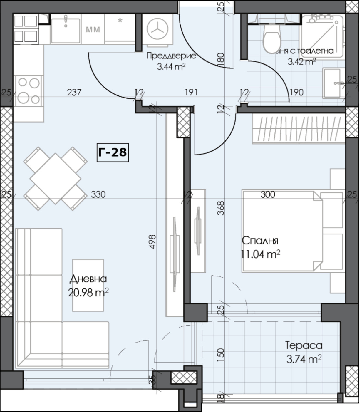 Предлагаме на вашето внимание двустаен апартамент, състоящ се от предверие, дневна, спалня, баня с тоалетна и тераса с източно изложение в секция Г.