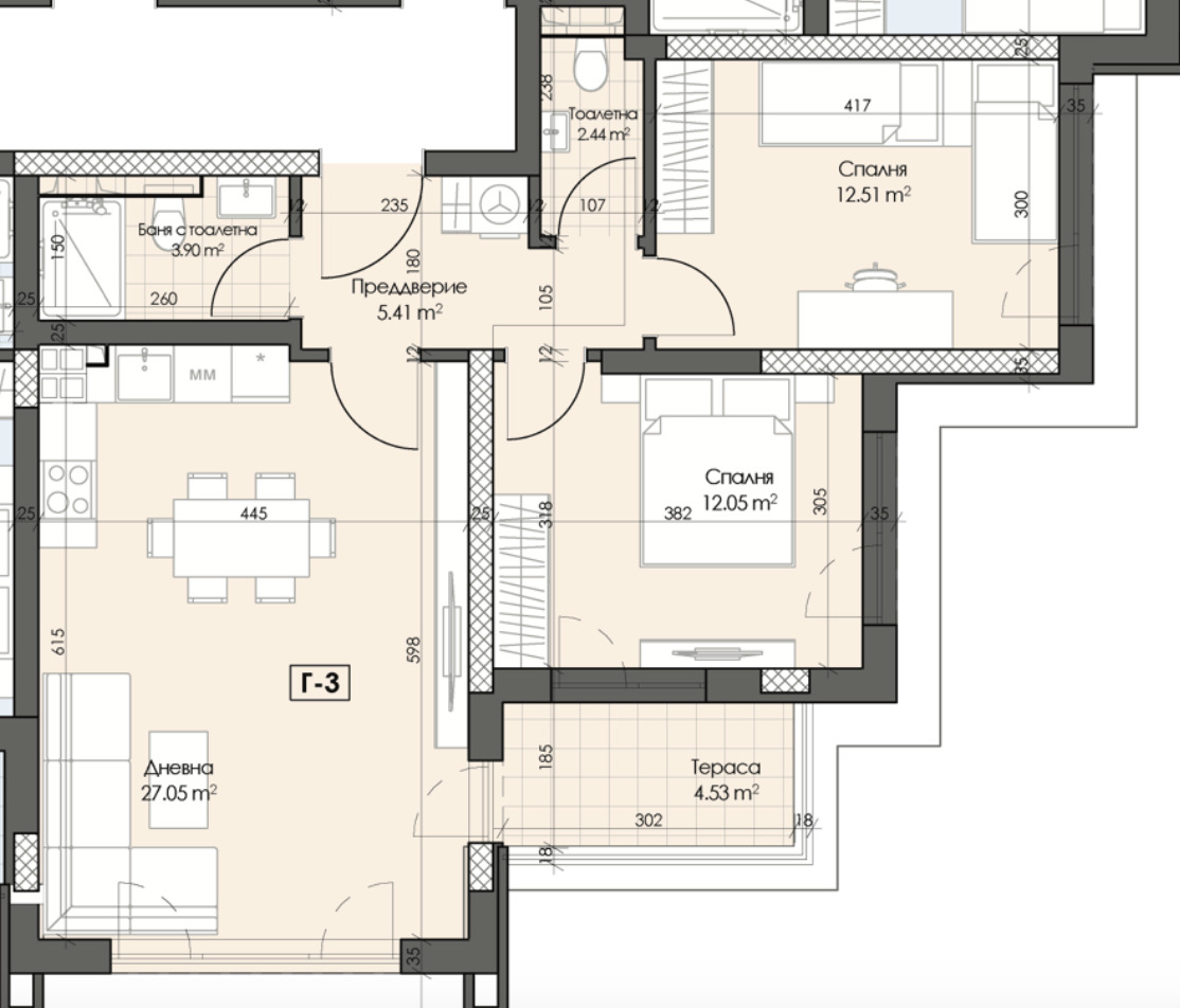 Предлагаме на вашето внимание тристаен апартамент, състоящ се от предверие, дневна, 2 спални, баня с тоалетна , тоалетна и тераса със североизточно изложение в секция Г.